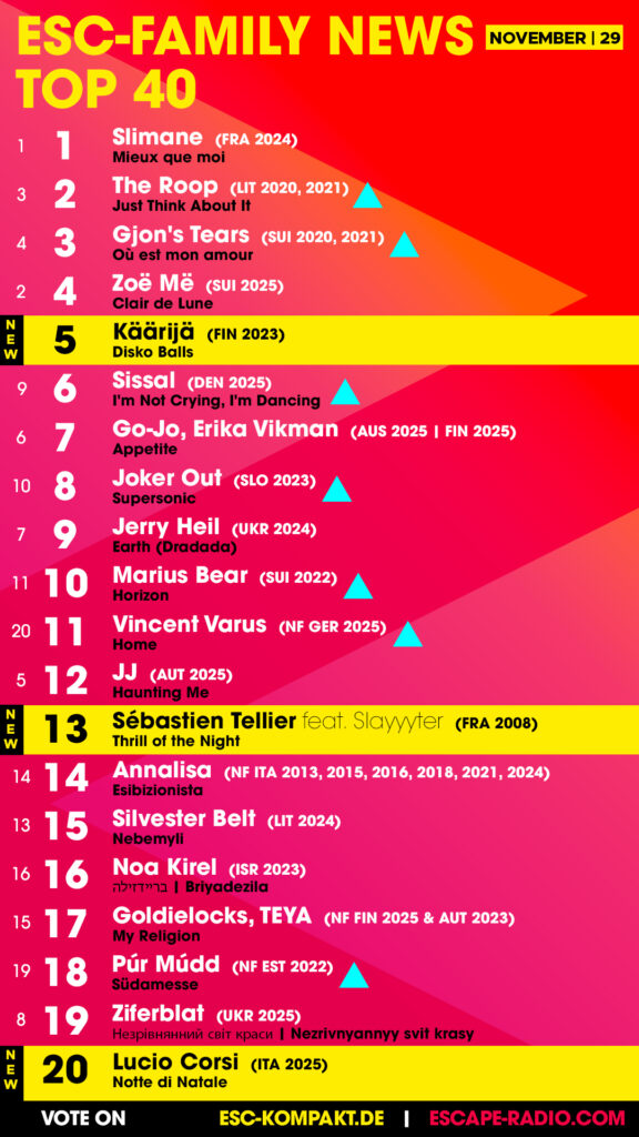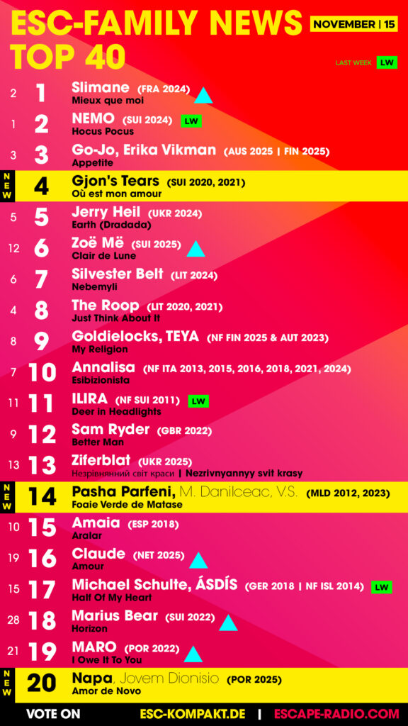 To do so, simply choose your up to five favorite songs from all the suggested songs from sundays to thursday evenings. The best of all the votes will be featured next week in our ESC-FAMILY NEWS Top 40!